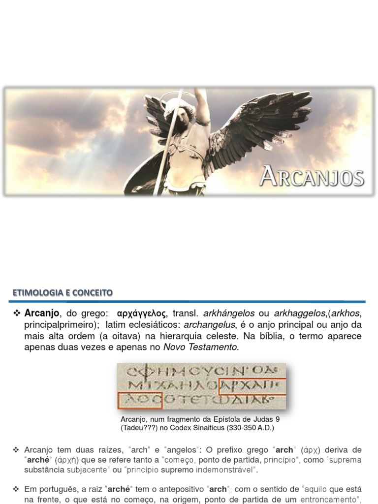 Arcanjo tem duas raízes, “arch” e “angelos”: O prefixo grego “arch” (ἀρχ) deriva de