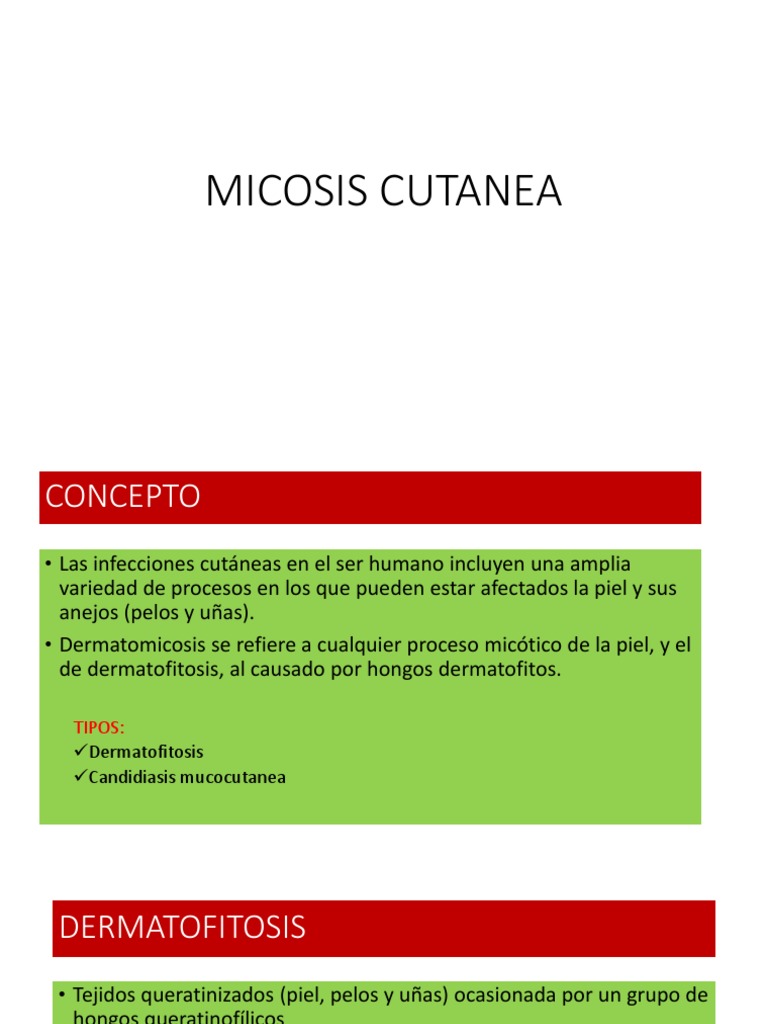 • Dermatomicosis se refiere a cualquier proceso micótico de la piel, y el