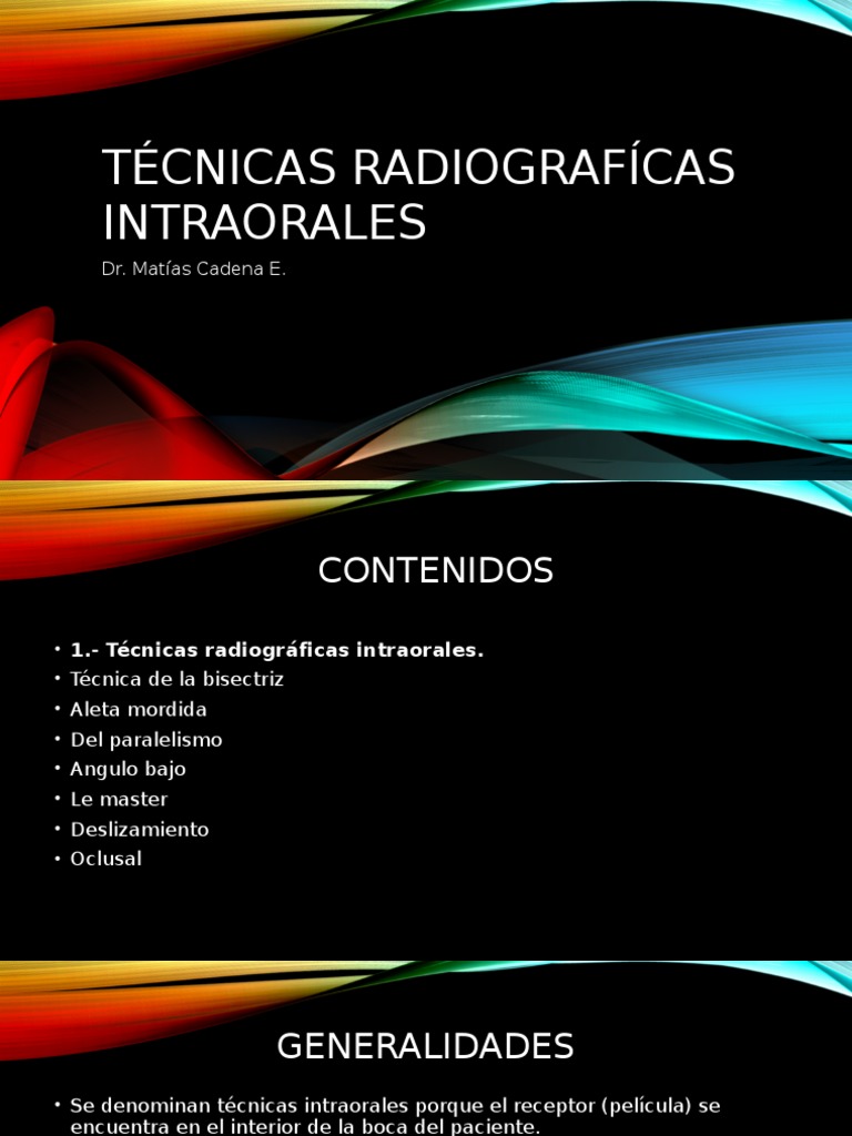 • Las técnicas intraorales se aplican con radiografía convencional o digital.