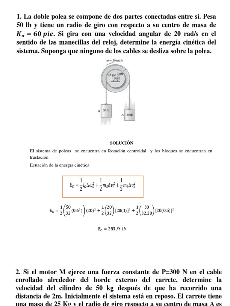 2. Si el motor M ejerce una fuerza constante de P=300 N en el cable