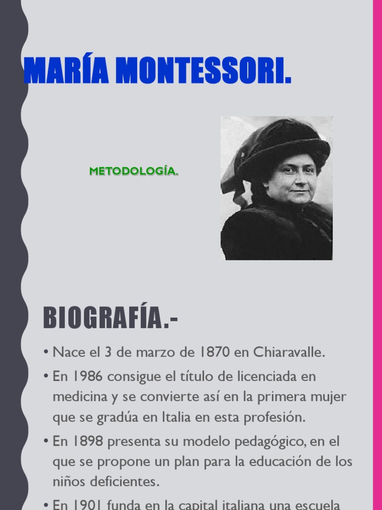 • En 1907, Montessori funda la primera de sus Case dei Bambini y en 1908
