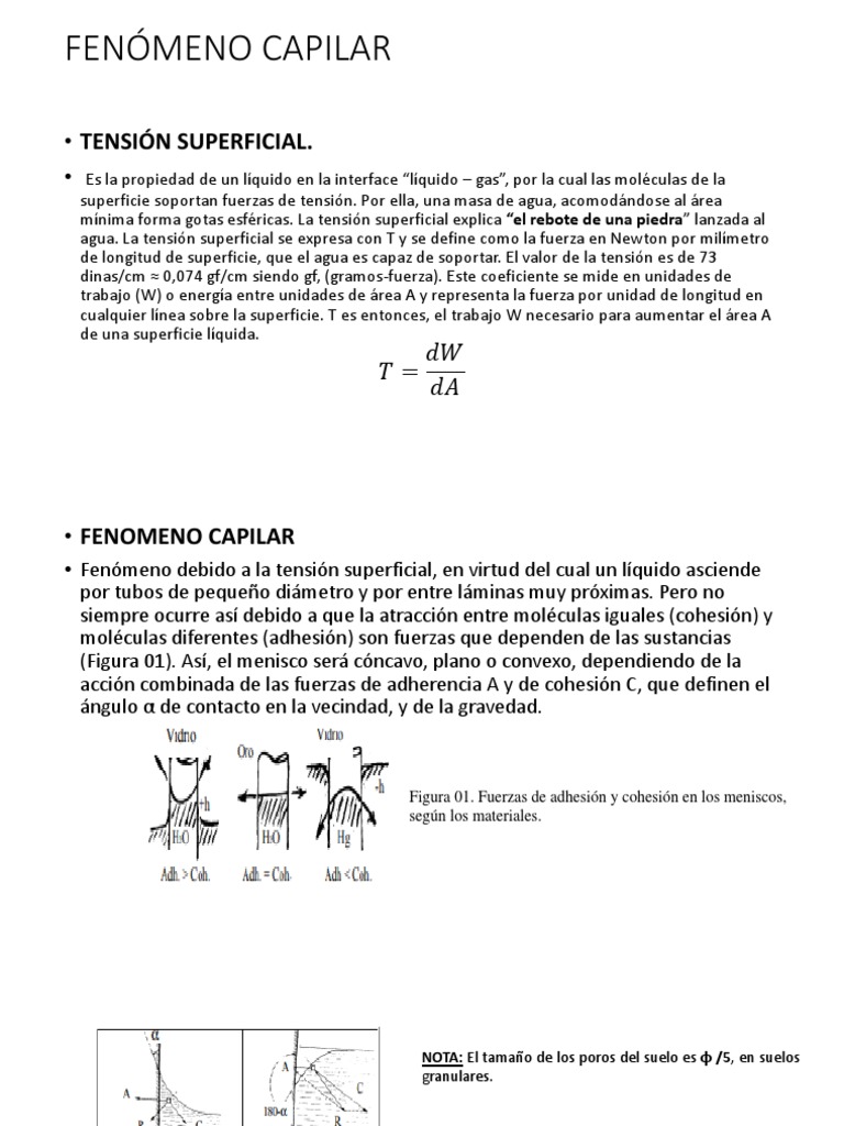• hc = altura capilar de ascenso del agua, en un tubo de estrecho radio R,
