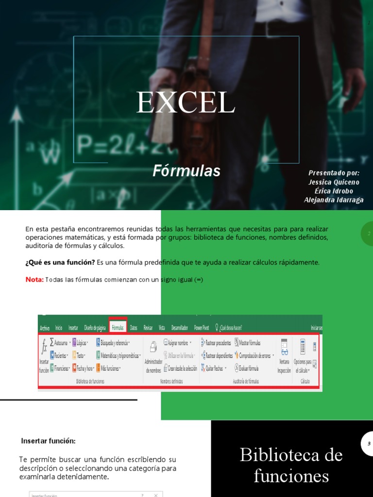 operaciones matemáticas, y está formada por grupos: biblioteca de funciones, nombres definidos,