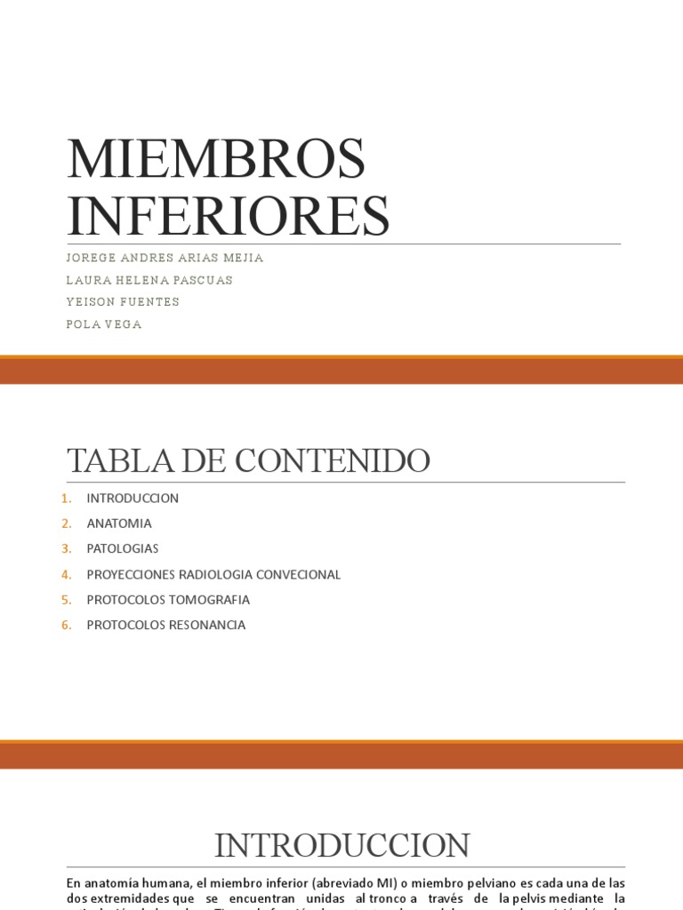En anatomía humana, el miembro inferior (abreviado MI) o miembro pelviano es cada una de las