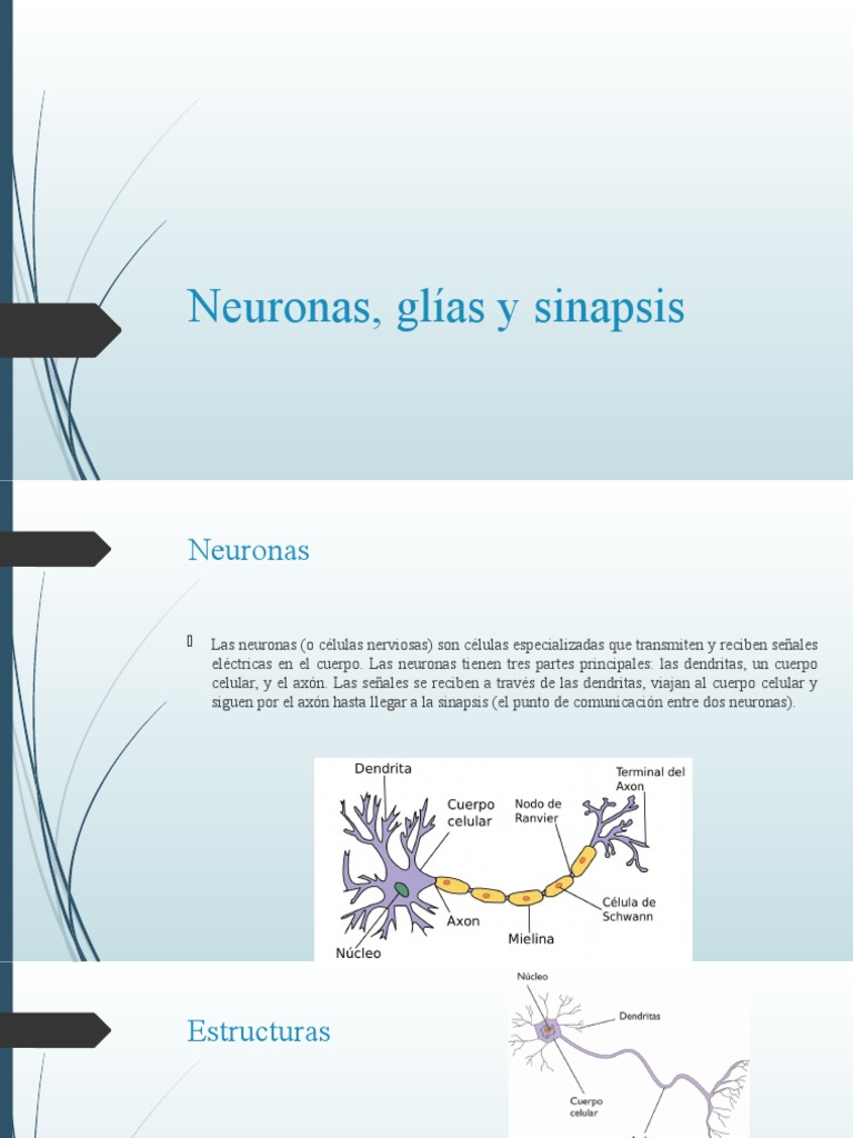 las neuronas, las células gliales no tienen axones, dendritas ni conductos nerviosos. Las