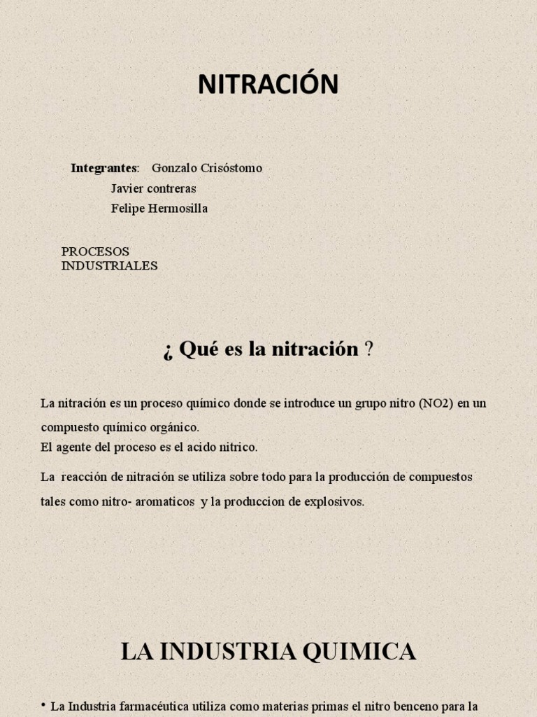 La nitración es un proceso químico donde se introduce un grupo nitro (NO2) en un