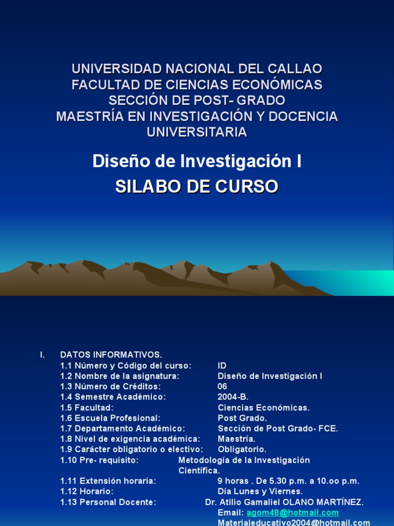 1.2 Nombre de la asignatura: Diseño de Investigación I