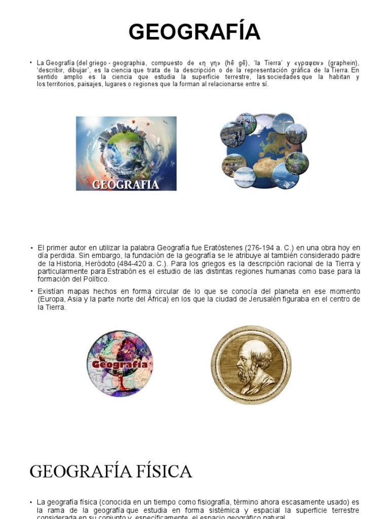 • La Geografía (del griego - geographia, compuesto de «η γη» (hê gê), ‘la Tierra’ y «γραφειν» (graphein),