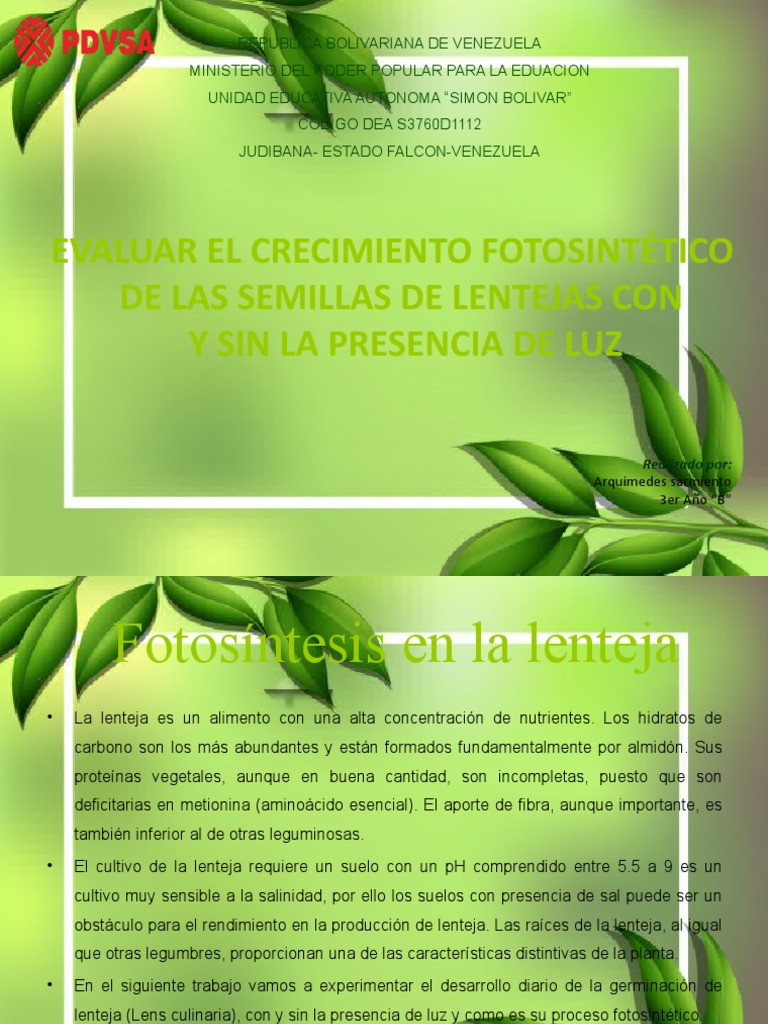 lenteja (Lens culinaria), con y sin la presencia de luz y como es su proceso fotosintético.