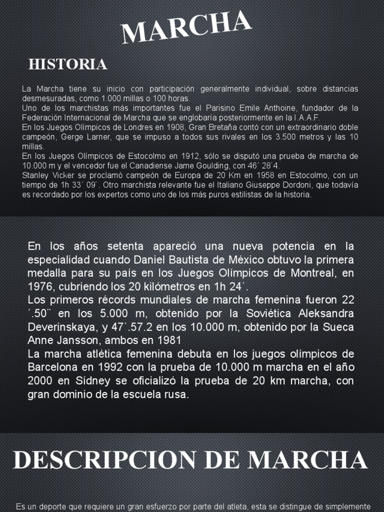 La Marcha tiene su inicio con participación generalmente individual, sobre distancias