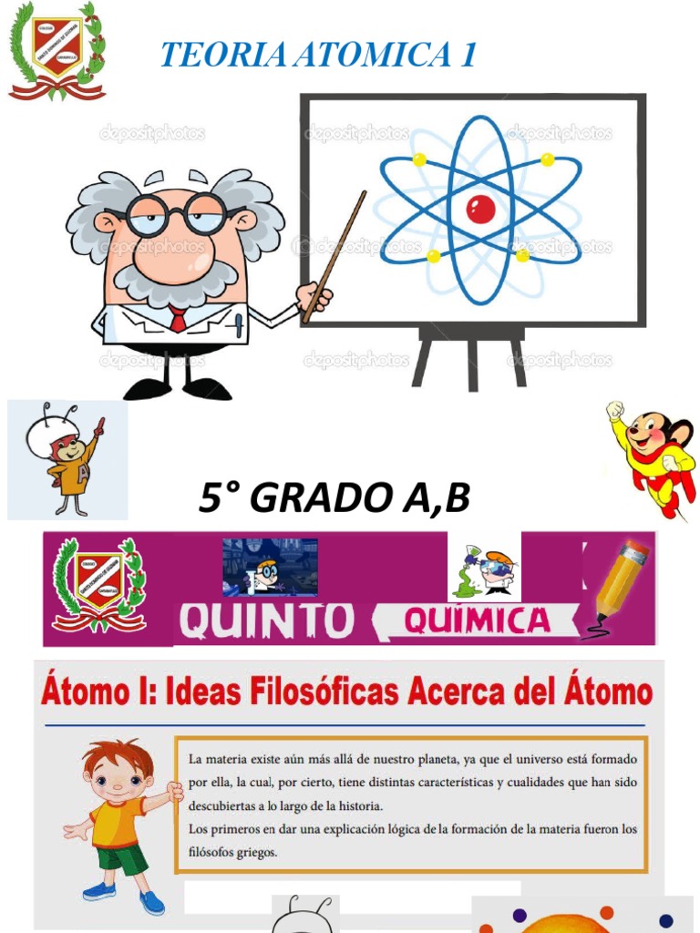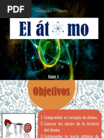 El documento habla sobre la teoría atómica desde sus orígenes en la antigua Grecia con filósofos como Leucipo y Demócrito hasta su desarrollo en la época moderna con científicos como Robert Boyle.