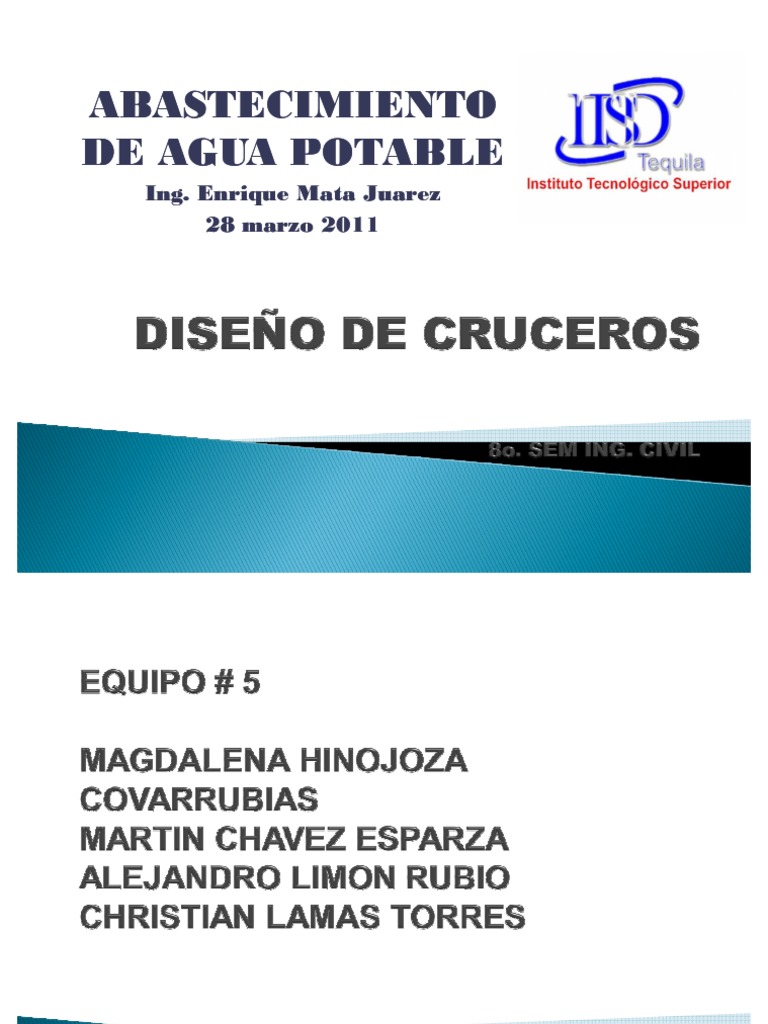 PROYECTO DE CRUCEROS. La elaboracin del plano de cruceros, para una Lnea de conduccin, constituye una de las etapas del proyecto, que requieren ms trabajo. Para la formacin de este plano de cruceros se recomienda seguir los siguientes pasos: 1.- Se numeraran en el plano de la lnea de conduccin todos los cruceros de proyecto, es decir, todos aquellos puntos de la lnea de conduccin, en donde se requiere proyectar la instalacin de nuevas piezas especiales y/o vlvulas. 2.- En una cuadricula (generalmente de 6 x 6 cm.) se dibujar detalladamente cada crucero, con las piezas especiales requeridas (existentes o de proyecto), representadas por sus signos convencionales. 3.- Al finalizar el proyecto de los cruceros, se recomienda revisarlos, marcando con algn color, tanto en el plano de la red, como en el plano del crucero, los nmeros de los cruceros bien proyectados. Los objetivos que se persiguen al elaborar el plano de cruceros, son: Proporcionar al Ingeniero Constructor, una gua para la formacin de los cruceros de la red. Cuantificar las piezas especiales y vlvulas, para las compras de las mismas. Poder elaborar el presupuesto de la red, para estimar el costo que tendr la misma.