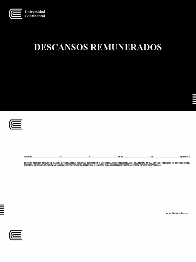 EN ESTA SEPTIMA SESION DE CLASES ESTUDIAREMOS TODO LO REFERENTE A LOS DESCANSOS REMUNERADOS PLASMADO EN LA LEY 728, VEREMOS SU ESTUDIO COMO