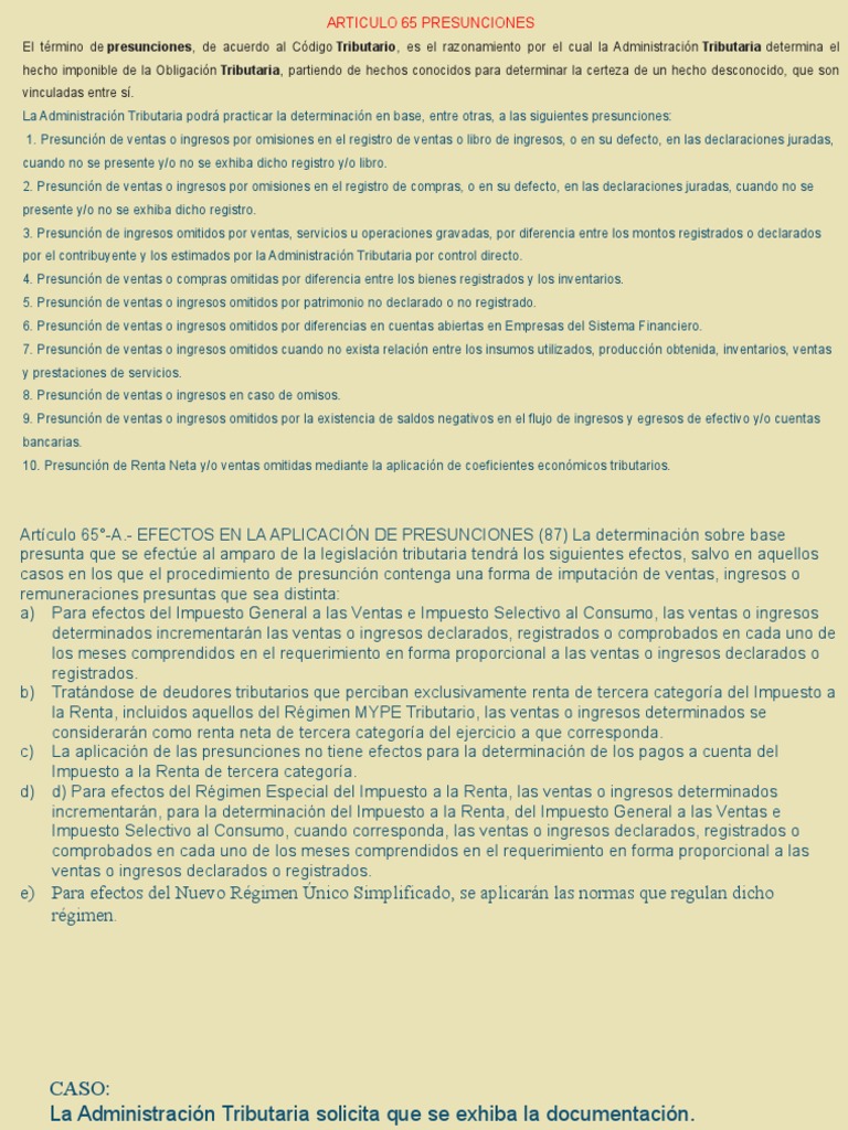 Artículo 65°-A del Código Tributario que indica cuáles serán los efectos de las presunciones: “Para efectos del Impuesto General