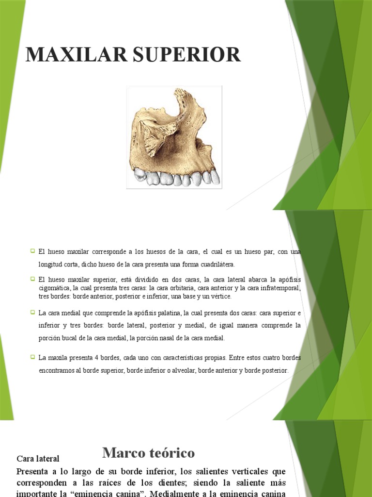 El hueso maxilar superior, está dividido en dos caras, la cara lateral abarca la apófisis