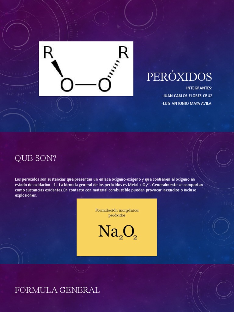 estado de oxidación −1.La fórmula general de los peróxidos es Metal + O₂²⁻. Generalmente se comportan