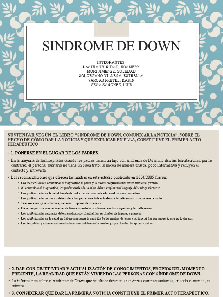 ◦ Que los profesionales de salud deben informarse más sobre este síndrome Down y recibir charlas de un especialista