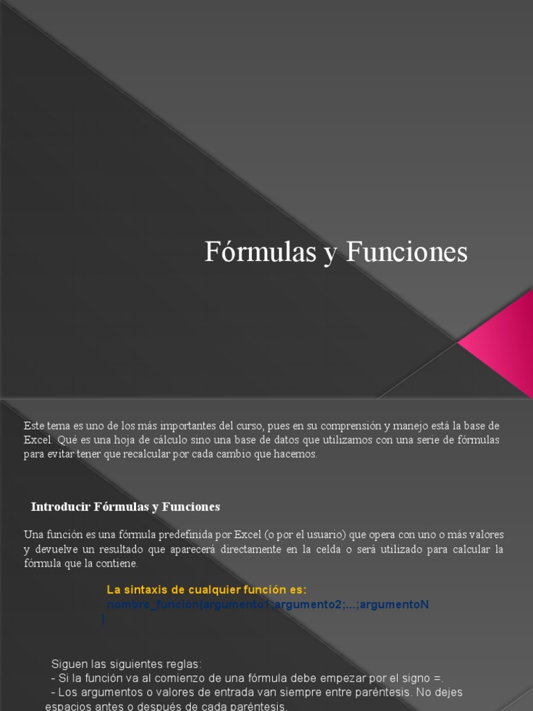 - Si la función va al comienzo de una fórmula debe empezar por el signo =.