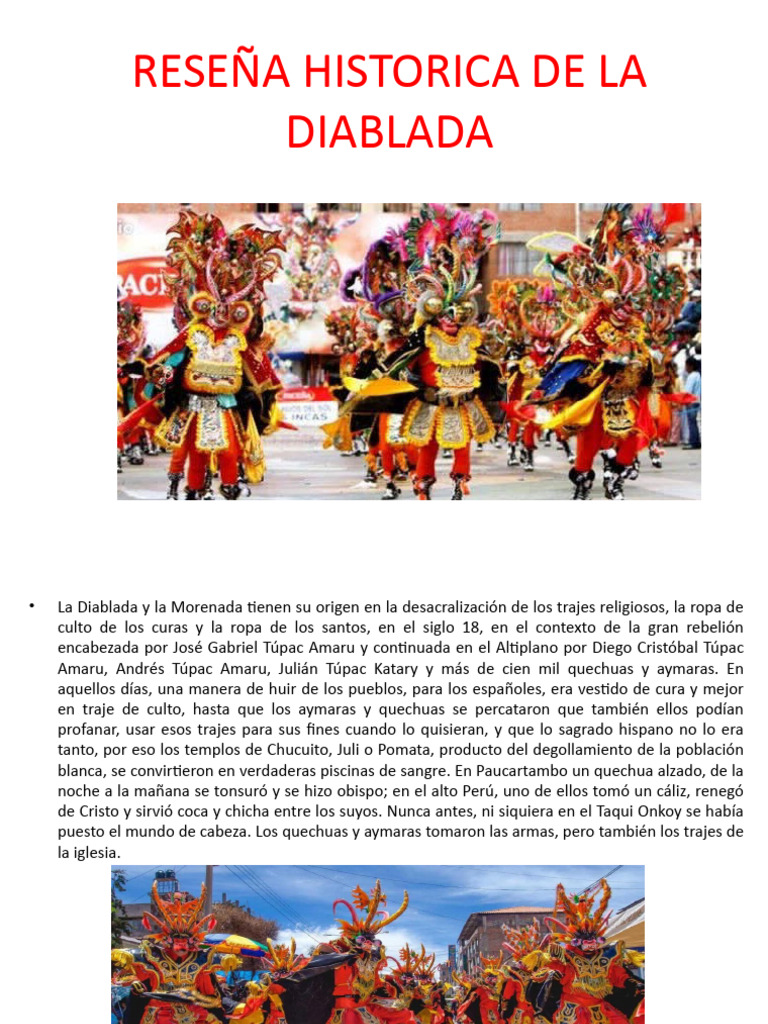 • La Diablada y la Morenada tienen su origen en la desacralización de los trajes religiosos, la ropa de