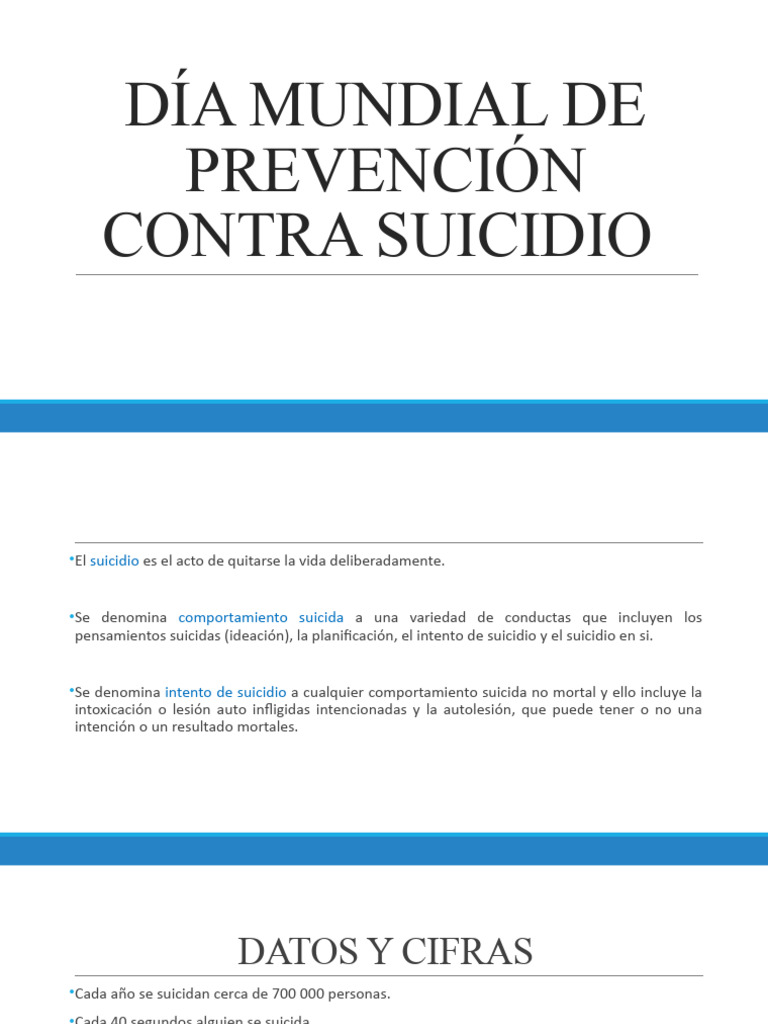 pensamientos suicidas (ideación), la planificación, el intento de suicidio y el suicidio en si.