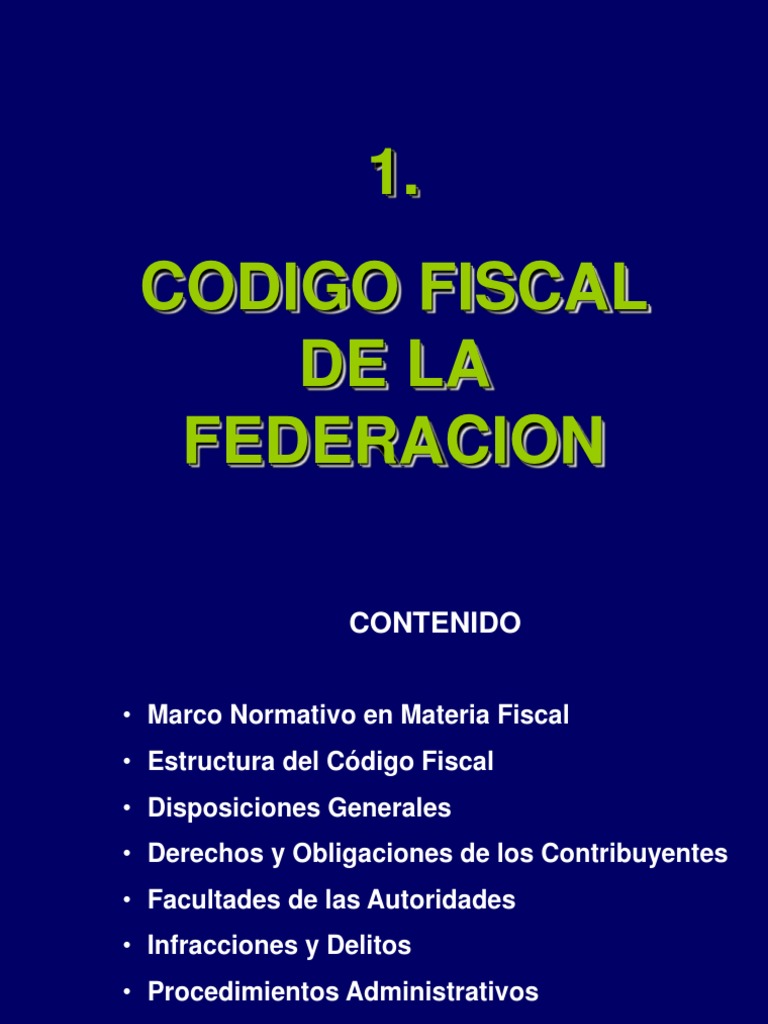 Marco Normativo en Materia Fiscal Estructura del Cdigo Fiscal Disposiciones Generales Derechos y Obligaciones de los Contribuyentes Facultades de las Autoridades Infracciones y Delitos Procedimientos Administrativos