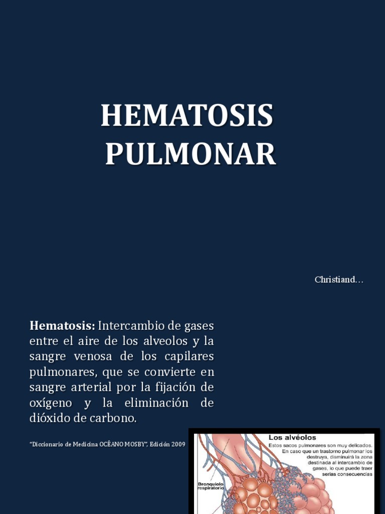 Hematosis: Intercambio de gases entre el aire de los alveolos y la sangre venosa de los capilares pulmonares, que se convierte en sangre arterial por la fijacin de oxgeno y la eliminacin de dixido de carbono.