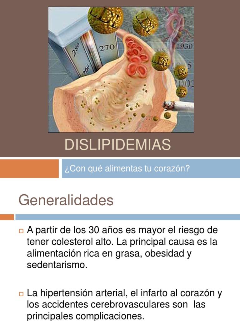 A partir de los 30 aos es mayor el riesgo de tener colesterol alto. La principal causa es la alimentacin rica en grasa, obesidad y sedentarismo. La hipertensin arterial, el infarto al corazn y los accidentes cerebrovasculares son las principales complicaciones.