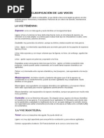 Se clasifican en soprano, mezzosoprano y contralto, siendo la de soprano la más aguda y la de contralto la más grave. Dentro de las sopranos hay