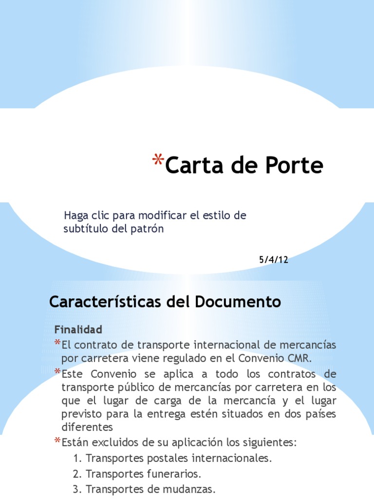 la carta de porte se harn constar una serie de indicaciones tales como: Lugar y fecha de su redaccin. Nombre y domicilio del remitente. Nombre y domicilio del transportista. Lugar y fecha de carga y lugar previsto de entrega. Nombre y domicilio del destinatario. Nmero de paquetes e identificacin de los mismos. Cantidad transportada. Precio y gastos del transporte. etc. * Es necesario que se expida una carta de porte CMR por cada expedicin que integre el vehculo, permitindose una sola carta de porte CMR si la carga se ha realizado 5/4/12 en rgimen completo.