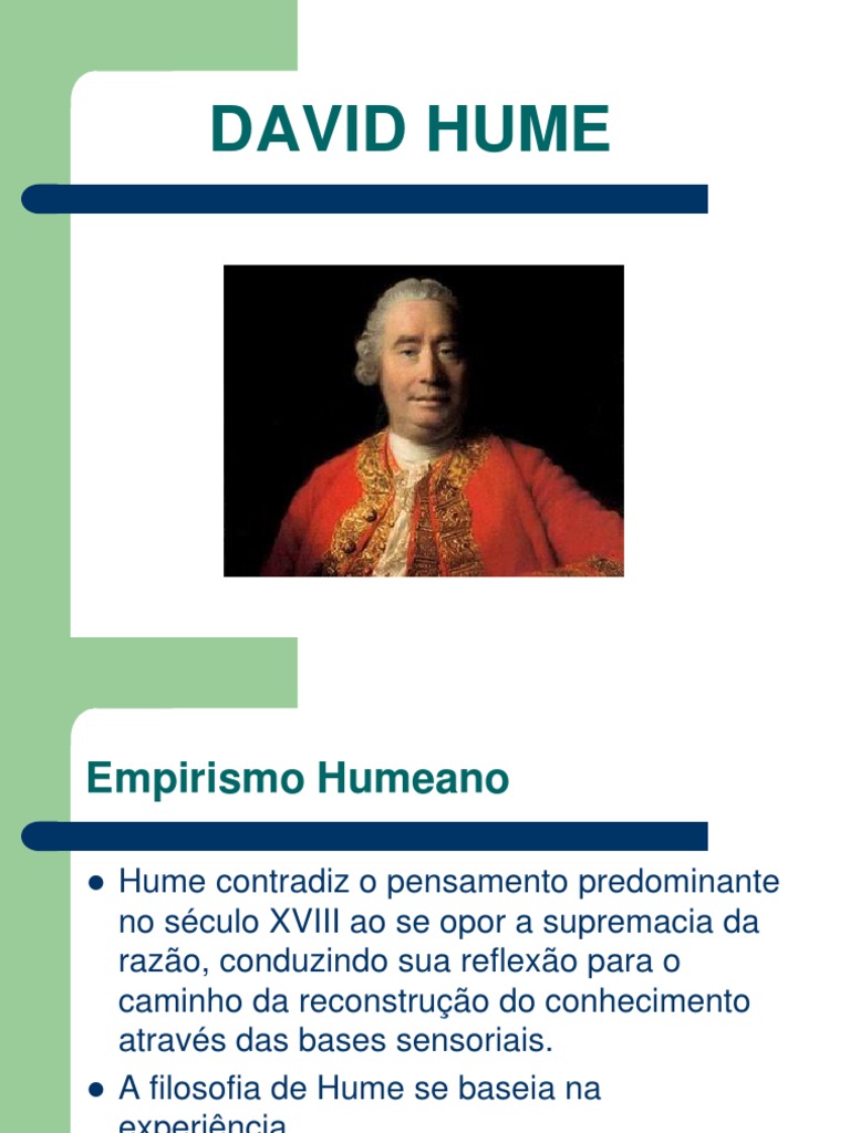 Hume contradiz o pensamento predominante no sculo XVIII ao se opor a supremacia da razo, conduzindo sua reflexo para o caminho da reconstruo do conhecimento atravs das bases sensoriais. A filosofia de Hume se baseia na experincia.