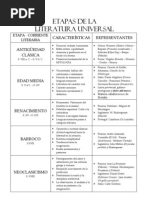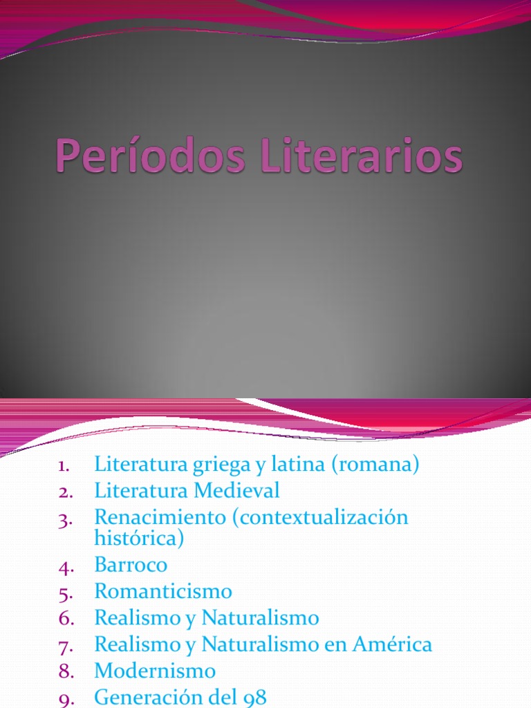 histrica) Barroco Romanticismo Realismo y Naturalismo Realismo y Naturalismo en Amrica Modernismo Generacin del 98 poca contempornea