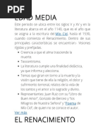 encuentran:- Visiones rgidas y prefijadas. Creencia a que el alma trasciende la muerte. Teocentrismo. La literatura cumple una finalidad didctica, ya que informa y alecciona. Temas que giran en torno a la muerte y la visin que tiene de ella la religin, el dolor y sufrimiento terrenal, relatos de la vida de los santos y el amor a lo sagrado y divino. Representantes: Juan Ruiz con su Libro de Buen Amor, Gonzalo de Berceo y los Milagros de Nuestra Seora y Poema de Mo Cid, de quien no se conoce el autor.