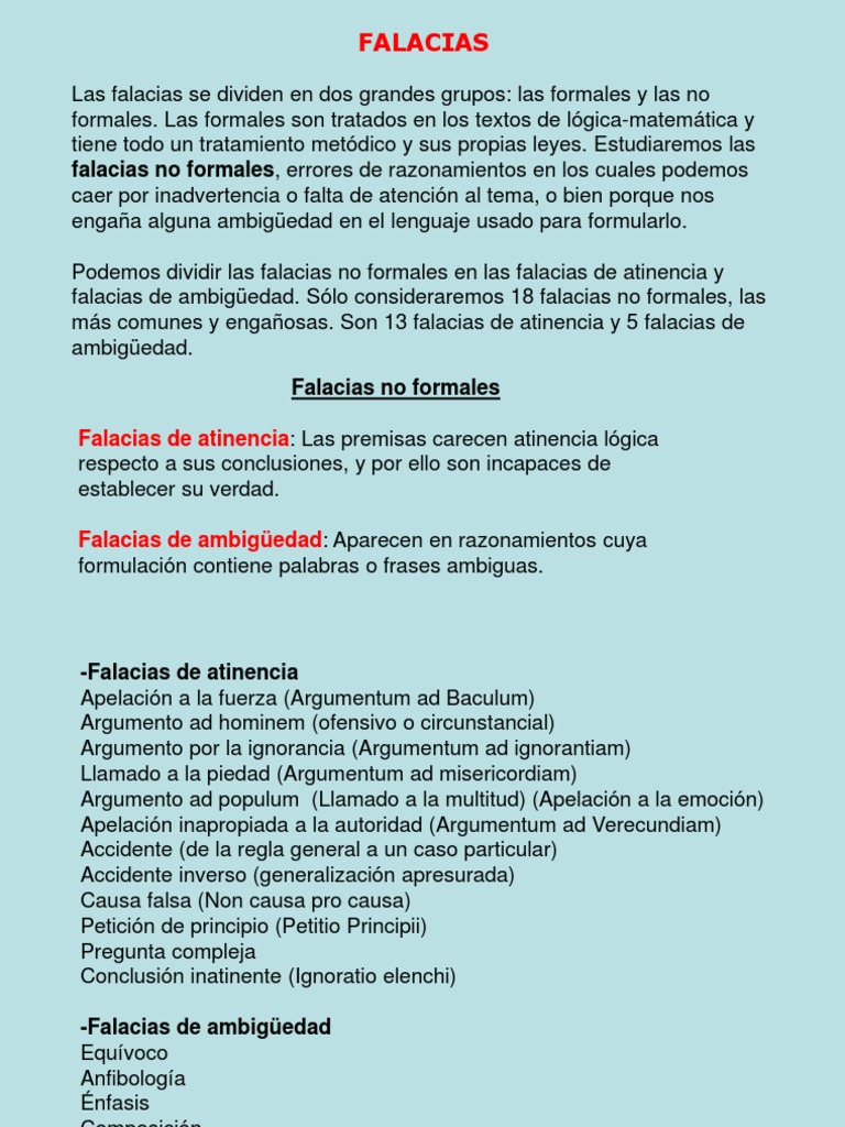 Las falacias se dividen en dos grandes grupos: las formales y las no formales. Las formales son tratados en los textos de lgica-matemtica y tiene todo un tratamiento metdico y sus propias leyes. Estudiaremos las falacias no formales, errores de razonamientos en los cuales podemos caer por inadvertencia o falta de atencin al tema, o bien porque nos engaa alguna ambigedad en el lenguaje usado para formularlo.