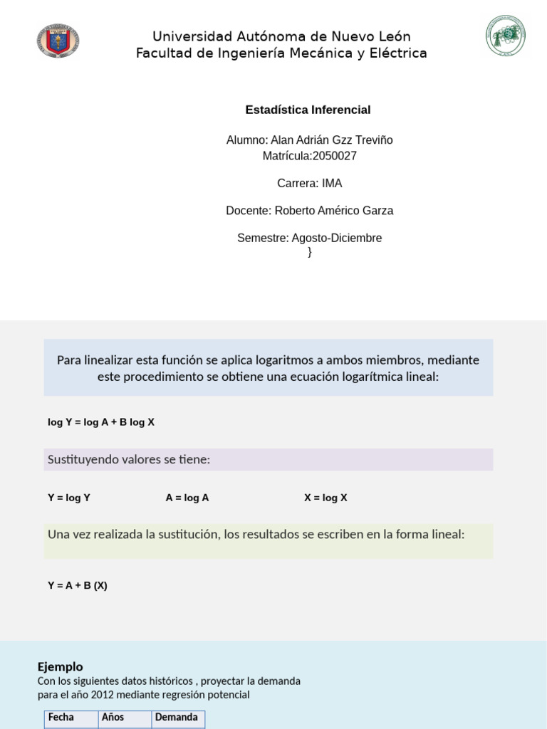 Con los siguientes datos, proyectar la demanda para el año 2012 mediante regresión potencial