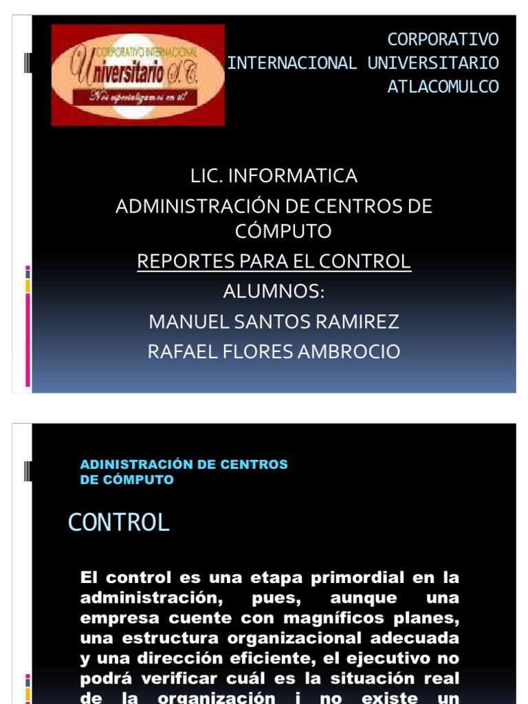 LIC. INFORMATICA ADMINISTRACIN DE CENTROS DE CMPUTO REPORTES PARA EL CONTROL ALUMNOS: MANUEL SANTOS RAMIREZ RAFAEL FLORES AMBROCIO