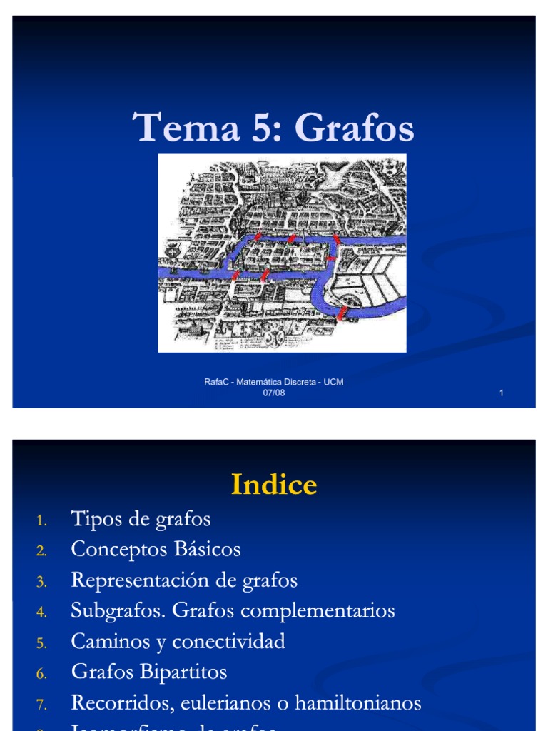 Tipos de grafos Conceptos Bsicos Representacin de grafos Subgrafos. Grafos complementarios Caminos y conectividad Grafos Bipartitos Recorridos, eulerianos o hamiltonianos Isomorfismo de grafos rboles