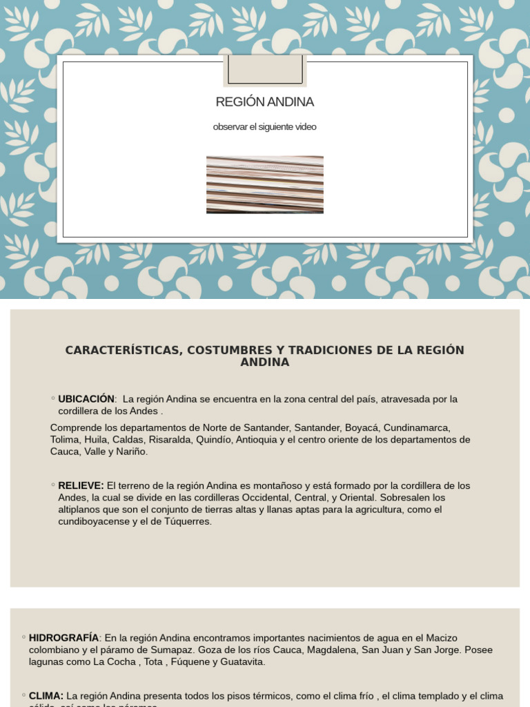 ◦ CLIMA: La región Andina presenta todos los pisos térmicos, como el clima frío , el clima templado y el clima