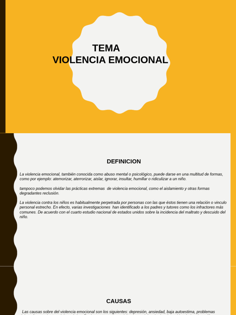 Las causas sobre del violencia emocional son los siguientes: depresión, ansiedad, baja autoestima, problemas
