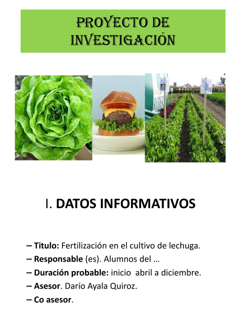 Titulo: Fertilizacin en el cultivo de lechuga. Responsable (es). Alumnos del Duracin probable: inicio abril a diciembre. Asesor. Daro Ayala Quiroz. Co asesor.