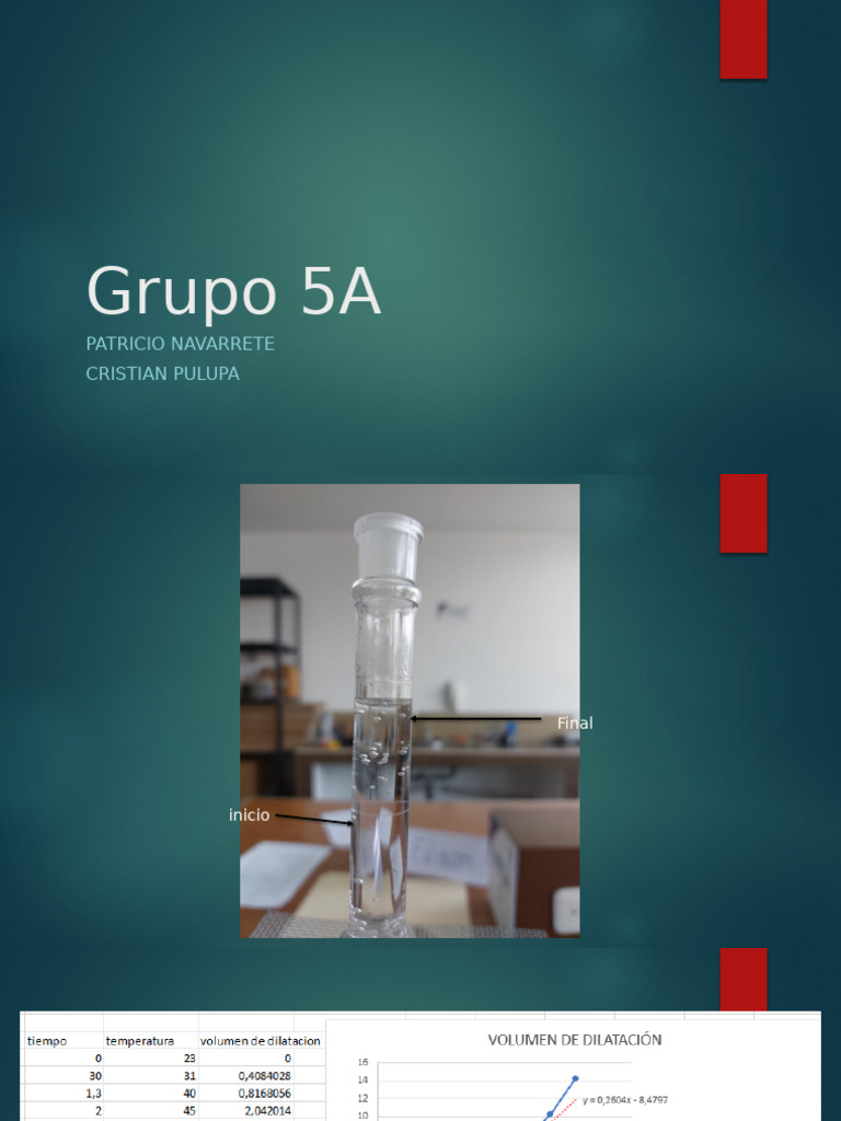 El documento presenta información sobre el coeficiente de dilatación del agua, que es de 270 x 10^-6 °C^-1. Se menciona que este dato es relevante para estudios relacionados con la física y la química del agua. El documento parece ser parte de un trabajo final del Grupo 5A.