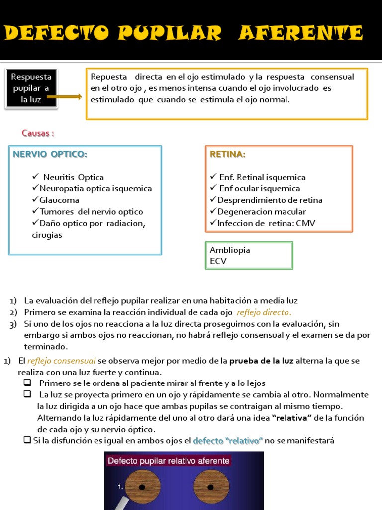 Repuesta directa en el ojo estimulado y la respuesta consensual en el otro ojo , es menos intensa cuando el ojo involucrado es estimulado que cuando se estimula el ojo normal.