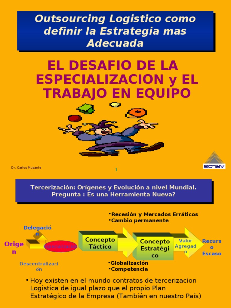 Permite Concentrar esfuerzos de la Organizacin en su negocio especifico,en aquello que saben hacer mejor o en aquellas actividades donde hay mejores ventajas competitivas o son mas rentables. Obtener y compartir una homognea y medible batera de KPI sobre Costos y Niveles de Servicio Incrementar el Nivel de Flexibilidad ante Cambios en los procesos de crecimiento o reduccin de actividad.Es decir, provoca un incremento del Ratio de Empresa Virtual Aumentar la Productividad y la Competitividad y la utilizacin de modelos de Benchmarking a traves del mejor aprovechamiento de los Recursos Humanos propios. El Outsourcing permite Globalizar toda la SCM dentro de la Regin en un solo 3PL o en un conjunto de 3PL que Dr.trabajan como Aliados Estratgicos Carlos Musante