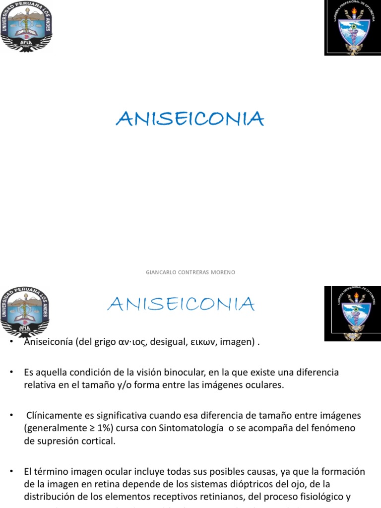 La mayora de la aniseicona sintomtica corresponde a la aniseicona ptica (debida a la compensacin de las ametropas GIANCARLO tanto refractivas como axiales) CONTRERAS MORENO