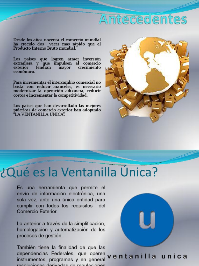 Es una herramienta que permite el envo de informacin electrnica, una sola vez, ante una nica entidad para cumplir con todos los requisitos del Comercio Exterior. Lo anterior a travs de la simplificacin, homologacin y automatizacin de los procesos de gestin.