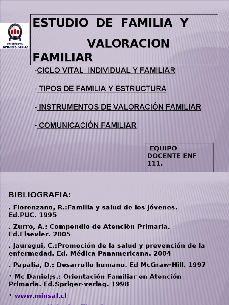 [Link] MARCO CONCEPTUAL DEL ENFOQUE FAMILIAR: - CICLO VITAL INDIVIDUAL Y FAMILIAR - TIPOS DE FAMILIA - ESTRUCTURA Y DINAMICA FAMILIAR - INSTRUMENTOS DE VALORACION FAMILIAR - COMUNICACION FAMILIAR 2. VALORAR ROL DE ENFERMERIA EN EL PROCESO DE ATENCION A FAMILIAS.