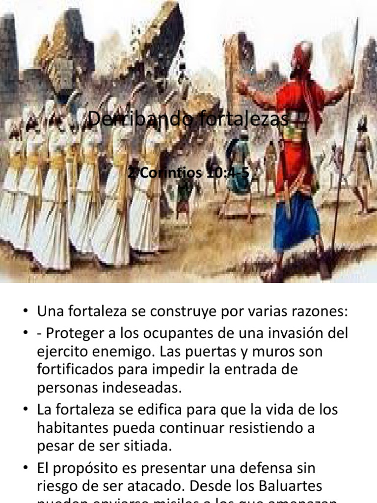 En el texto mencionado anteriormente, Pablo habla de la destruccin de fortalezas. Se refiere a toda altivez y argumentos carnales que estaban resistiendo la entrada de la luz Recuerda que est dirigiendo sus palabras a los oyentes. Aqu no habla de los que estn en tinieblas sino a los que tiene bastante luz y estn llenos del Espritu santo. Aunque haban recibido el Espritu Santo y los dones del Espritu funcionaban en ellos, tenan conceptos muy equivocados que Pablo describi como fortalezas espirituales. El prejuicio es una forma de fortaleza que impide la entrada de la luz.