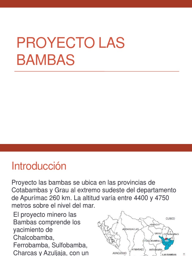 Proyecto las bambas se ubica en las provincias de Cotabambas y Grau al extremo sudeste del departamento de Apurmac 260 km. La altitud vara entre 4400 y 4750 metros sobre el nivel del mar. El proyecto minero las Bambas comprende los yacimiento de Chalcobamba, Ferrobamba, Sulfobamba, Charcas y Azuljaja, con un rea de concesin minera de 35,000 has.