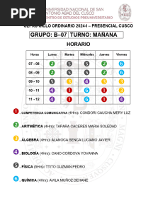 Horario B-07 Mañana Presencial CuscoPDFHorario B-07 Mañana Presencial CuscoAgregado por gherard stiven peña huillca0 calificacionesfunction cn(e,t){var n=e+t;return n<=0?0:Math.round(e/n*100)}% encontró este documento útilGuardar Horario B-07 Mañana Presencial Cusco para después